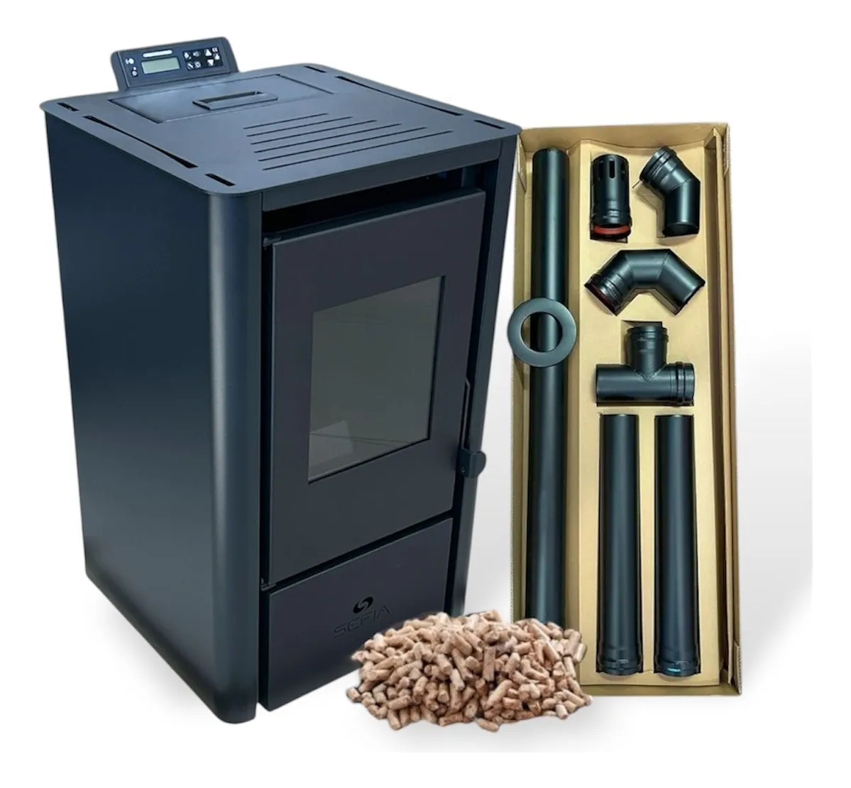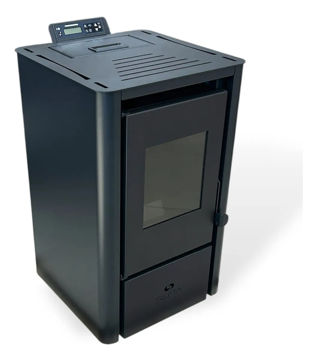 6. LCD panel de control: se coloca en el lado superior de la estufa, simple y fácil de utilizar. Es posible planificar el cambio semanal de encendido y apagado de la estufa (fin de semana incluido).