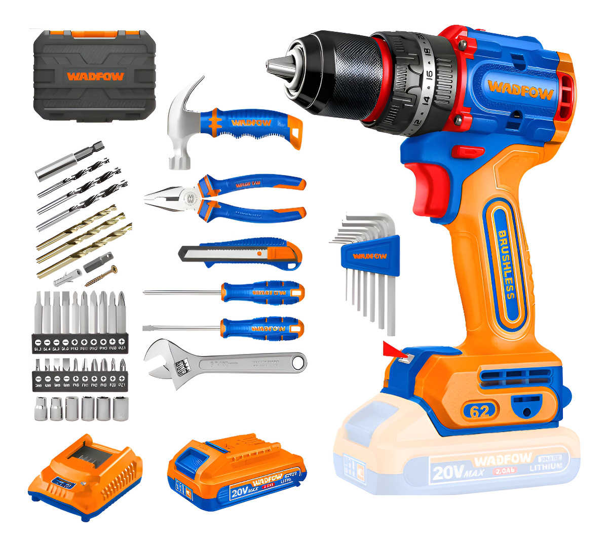 SET DE HERRAMIENTAS 91 PCS + TALADRO ATORN. C/ PERCUTOR 20V 62NM A BATERÍA + 2 BAT + CARGADOR + VALIJA