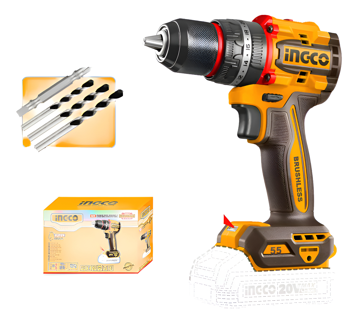 TALADRO ATORNILLADOR C/PERCUTOR A BATERIA 20V P20S BRUSHLESS 55NM CON ACCESORIOS, S/BAT Y S/CARG